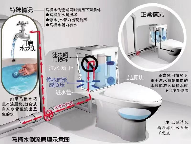 個別用戶發(fā)現(xiàn)從水龍頭中放出的自來水有時會呈現(xiàn)藍色。出現(xiàn)這種現(xiàn)象是因為用戶在廁所水箱內(nèi)放有潔廁靈(藍色),同時馬桶進水管止回閥損壞導致。正常情況下,在管網(wǎng)壓力的作用下,水的流向是正向的。但由于停水或者樓下有用水,在開啟閥門或水龍頭的瞬間,由于水流的突然變化,使樓上未用水的管道內(nèi)產(chǎn)生了瞬時負壓,將水箱內(nèi)的水抽入管道內(nèi),即產(chǎn)生了藍水現(xiàn)象。只需加裝止回閥,即可解決問題。